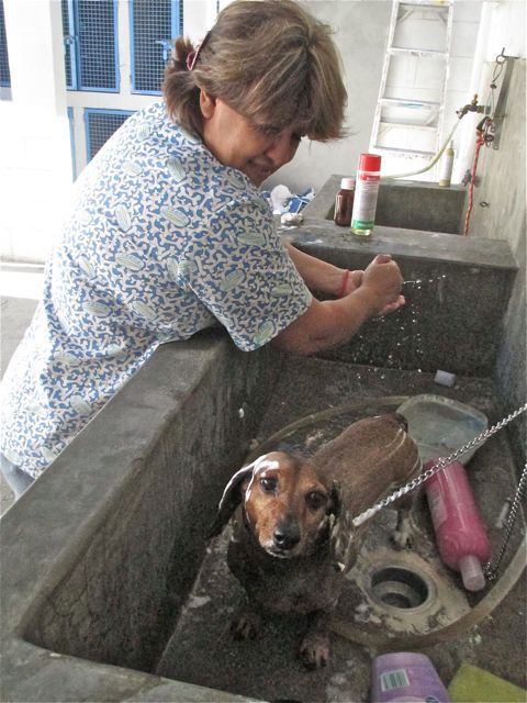 Carmeh is the first to get bathed and we had to muzzle her as she hates strangers handling her. Normally we are not allowed to be behind the scenes but they did make an exception for for us. I know she thought that she was being tortured.