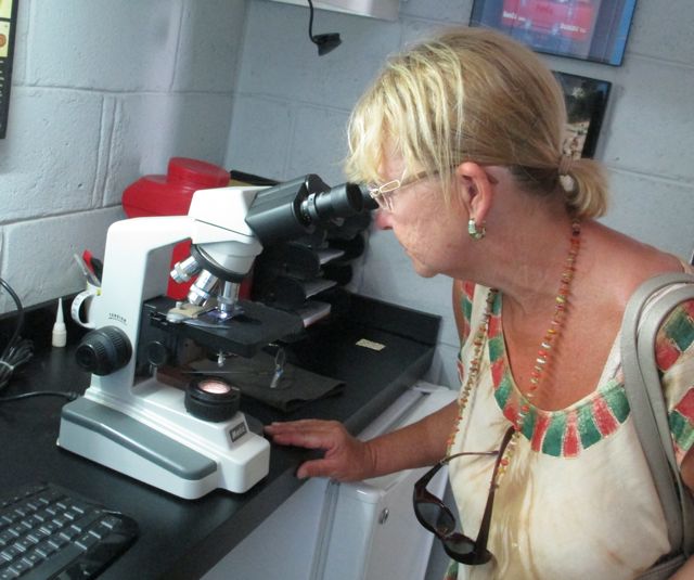 Within a few minutes Dr. Marco diagnosed fleas! Our girls had fleas! How could they? They are on all the usual preventative medications. Sure enough he showed us that the black worm like bits we found in the bed were actually flea excrement, a simple test done with a paper towel and warm water. Then he showed us a flea on Caeli near her rectum. We were in shock. Dr. Rafael never did examine Caeli and just looked under the microscope at the black worm like bits and announced that she had worms. We were shocked at that time also, as the girls are on the usual worm preventative medications given monthly. However as the black worm like bits kept appearing, now almost 6 weeks later, we knew there as something wrong and hence the visit to Dr. Marco.