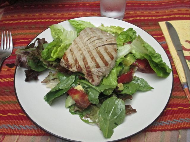 Lunch was perfect. A bed of greens, baby romaine, arugula, heirloom tomatoes and avocado made the perfect resting place for grilled tuna. Of course the unique dressing made with imported oils and vinegars made the meal GOURMET with capital letters.
