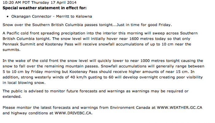 Well that was the plan but Environment Canada has issued the following weather warning.