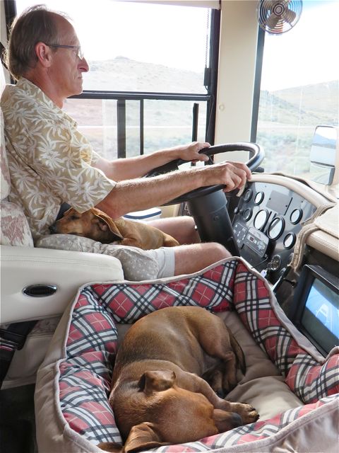 This is how we travel. Taken a few days ago when it was warmer. Now the girls are covered in blankets. They dislike the cold and shiver for the first hour or so of the day. Now that we are back in the rain, they will only go out as necessary and very briefly at that.