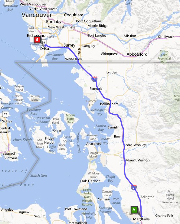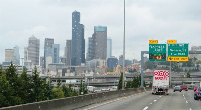 Colin had an appointment in Everett with a chiropractor he had been seeing for over thirty years. Only he has moved since the last time we were here and we had very carefully asked about parking for our big rig and car. We explained to the receptionist on the phone that we could not back up and were like a city bus that needed to turn around. No problem she said. Not true! There was no parking on the narrow street and we ended up in an unmarked dead end. So Colin unhooked and found parking for the RV and I found a spot for the car about a block away. I guess most people drive a car to an appointment, not a bus. After the appointment we simply stopped in the middle of the road and rehooked and off we went to find a spot for our last night in the USA. Walmart in Marysville, WA. Today we drove a total of 331 miles. I have a few photos that never made the blog in the past few days. I like to call them, scenes from I5.