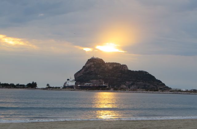 The last sunset of January, considering the heavy cloud cover it was respectable. Big freighter coming into port.