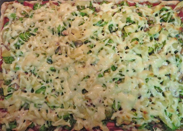 I did make pizza last night and it was perfect. First I made the crust then added pizza sauce and topped that with a mix of chopped swiss chard and kale fresh from my garden. That was topped with broccoli, soy pepperoni, mushrooms and pineapple and of course wonderful Chihuahua cheese. We even have leftovers.