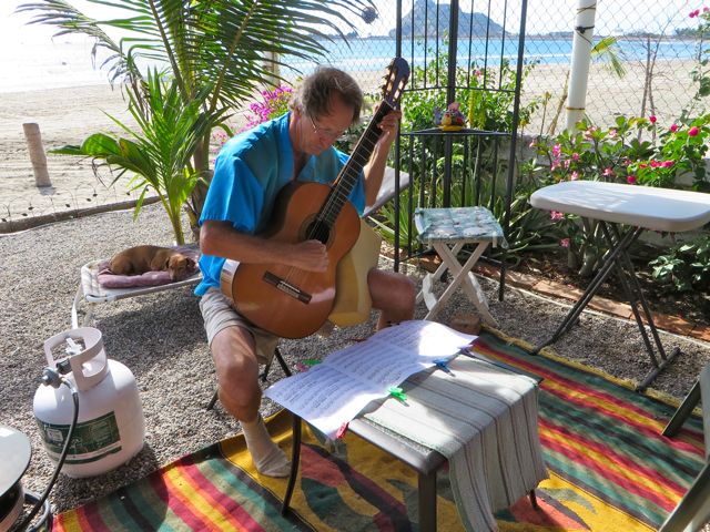 ...Colin had to be creative. If you look closely you will see he is sitting with his back to the wind off the ocean and his sheet music is being held in place with clothes pegs. That is Carmeh behind him on the chaise.