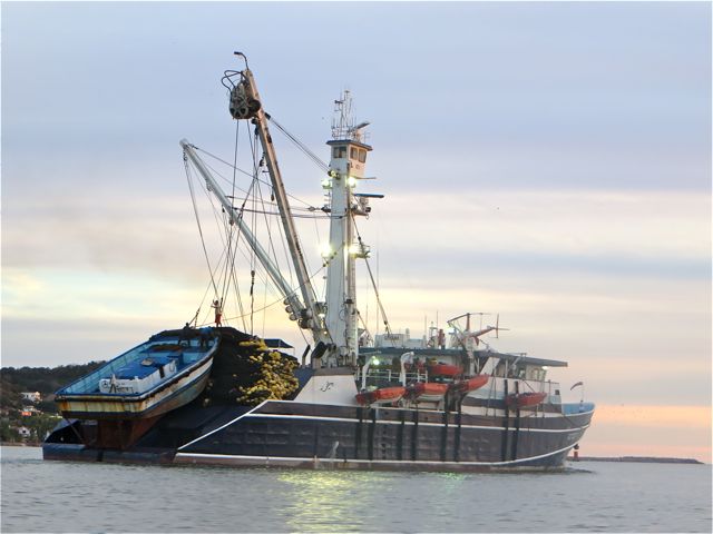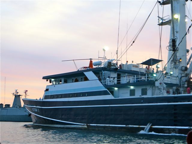 First we had to cross the shipping channel and our lancha came to dead stop as this tuna boat passed in front of us. That helicopter looks pretty tiny up there.