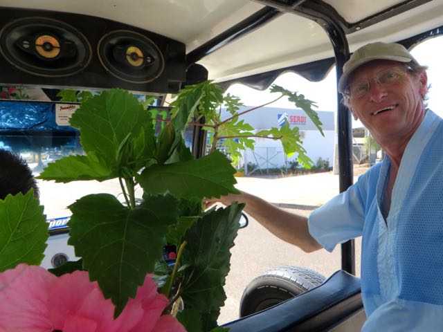 Are the flowers both hibiscus – they are beautiful. Especially love that pink one. Hope you get to harvest a papaya from your tree before you leave in the Spring – not sure how long they take to produce. Where was the nursery located? You look very fetching in your big hat.