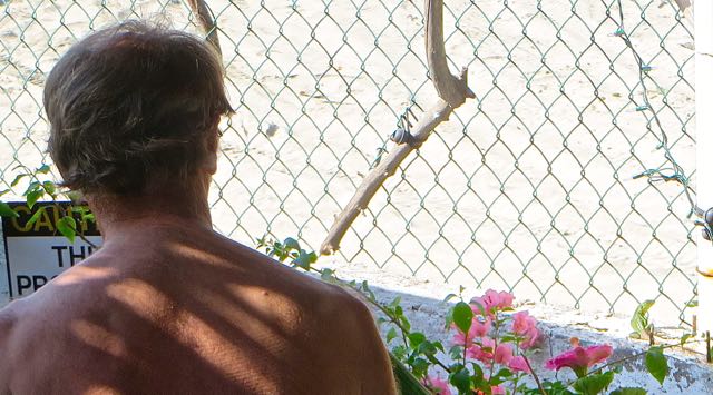 Just after our morning walk I noticed ‘the iguana’ stalking my hibiscus.  Really hard to see him but he is green and slim and is sitting on the white wall just above the leaf on the right.  Day after day he has been devouring my hibiscus on this side of the yard.