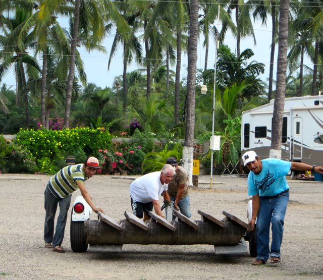 Micheal is in site #3 and there were steps built for site # 2 last season which were in storage. The owner of the park said it was alright to move the steps into place. Brilliant idea to use another RVer’s car dolly to do the heavy work.