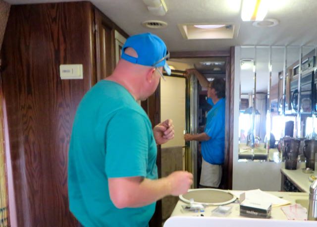 The list is long and one the items will take a full three days of work. Yesterday he installed a new Fantastic Fan in our bedroom ( yeah cool air once again ), repaired our shower door closure and did some work on our rooftop A/C covers.