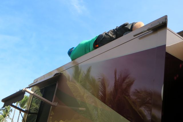 For some reason I thought that Friday, our first day back in our site would be a normal day.  Well it certainly wasn’t.  Because of the bedroom slide glitch I had sent Erik, our wonderful RV tech guy the info about it Thursday evening.  No sooner had we come back from our Friday morning beach walk, made coffee ( well our kind of coffee ) and cut up the fruit, placed it outside onto our tables, than Erick drives in. We never had a bite nor a sip.  First thing he did was check the slide and source the cause of the problem and in no time had it repaired.  We then had a few other to do’s for him to deal with such as a broken cabinet latch and a broken front door latch and so on.