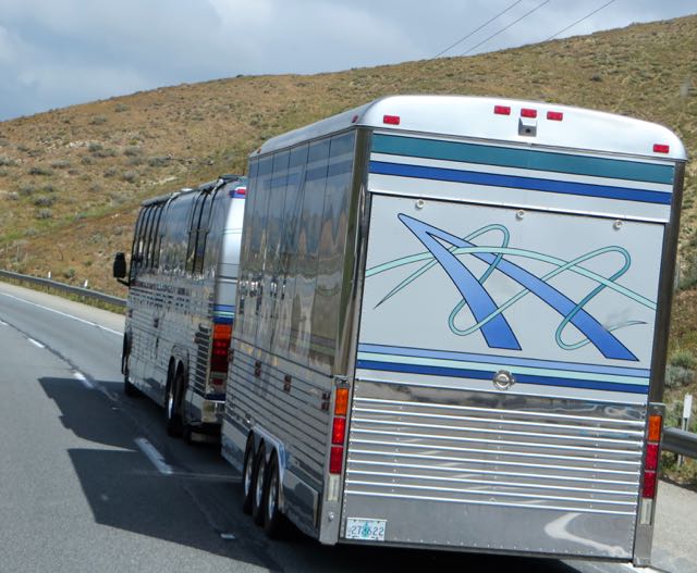 We traveled off and on along side this Prevost today.  We imagine that he was carrying his car, matching golf cart and a few toys with him as he headed North to Oregon.