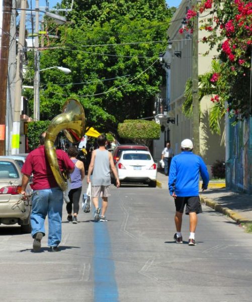 This is the blue line painted on the road for the benefit of the cruise passengers to find their way into Centro from the cruise ship terminal. Just in front of the tuba player is the young couple we had met earlier in the morning, obviously following our advice to follow the blue line. The fellow on the right in the blue jacket is a volunteer, one of many who are available to help the tourists.