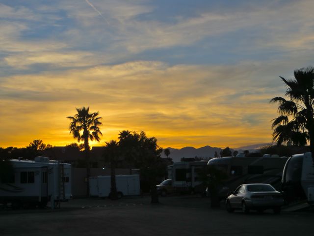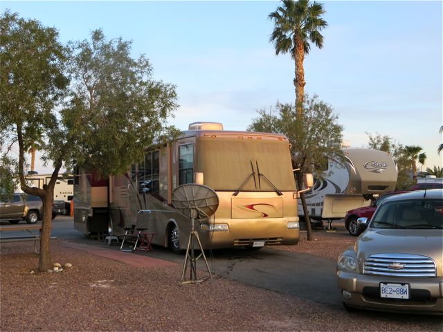 We did stop in Searchlight for breakfast which was a first and we did enjoy it.  Once we arrived at the Las Vegas RV Resort which was suggested by a blog reader ( thank you ), we got down to doing a full set up including car hand wash  ( it cost 25.00 to do a full wash but we used our on board Mexico water  in a bucket at no charge,  🙂 ) and front RV window wash.  As we have no idea how long we will be here, we set up our satellite TV dish., changed the bedding, etc.  We both were feeling run down and had a few naps.  After a very light dinner we were in bed by 9PM.