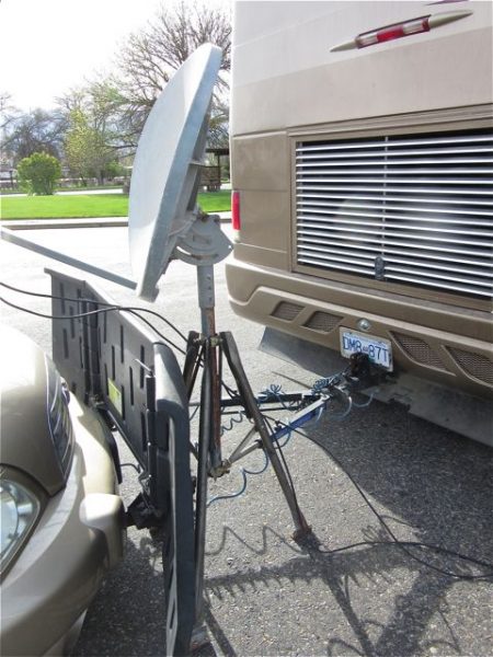 So Colin set up our dish between the car and the RV to tape it and the inverter did the rest. Perfect solution. I would like to say that I slept well last night but the trucks coming and going had me up every other hour.