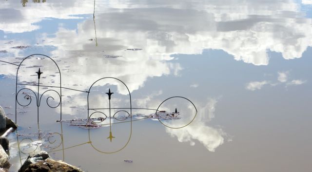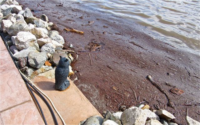 Our dog fence which is set over the declining slope of the rocks of our shoreline was showing the level of the rising lake.