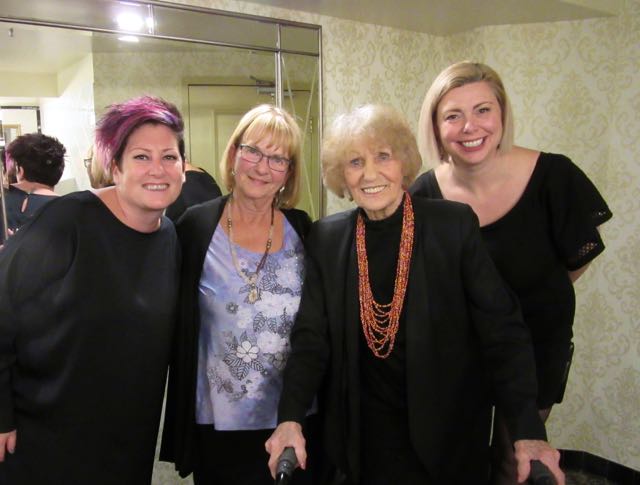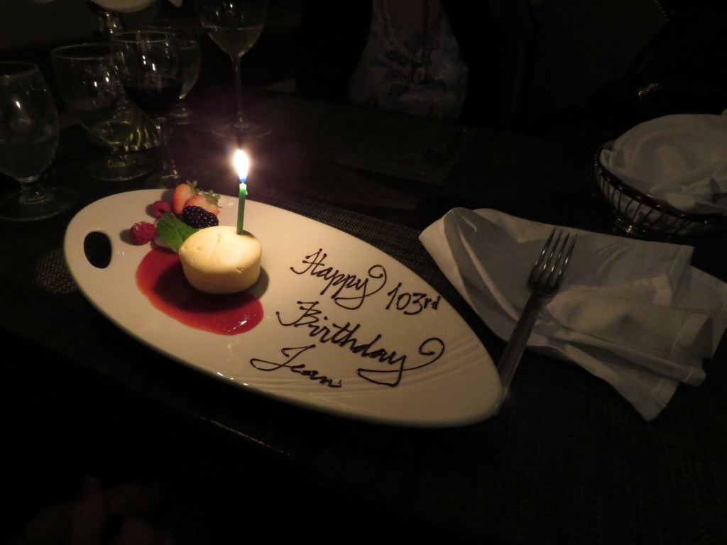 So it was time to leave. First I took her to the washroom and while in my own stall she came out of hers and was suddenly surrounded by ladies. I came out and realized that she had left her walker behind in her stall. It was a hoot, all the attention. The lady on the right had turned 43 while Mommio was turning 103. She kept repeating that Mommio was 103, 60 years older and looked better than she did.