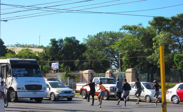 Right on the street corner next to the tire place were some street performers. Boundless energy. You might say that they had a captive audience. Just as the traffic light changes they pass a hat for coins.