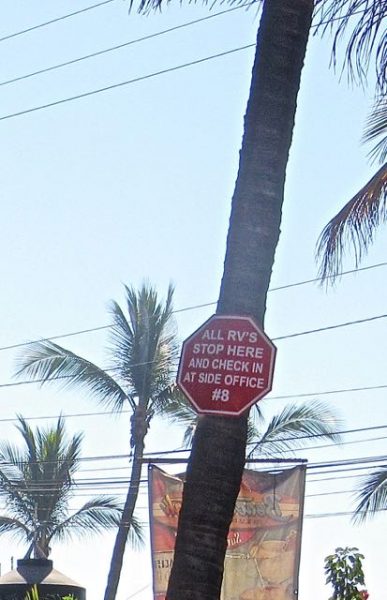 Not much space between the tree with the sign and the one to the left of it for an RV to pass thru and make a left turn where RV 2 is located. It did eventually get in.