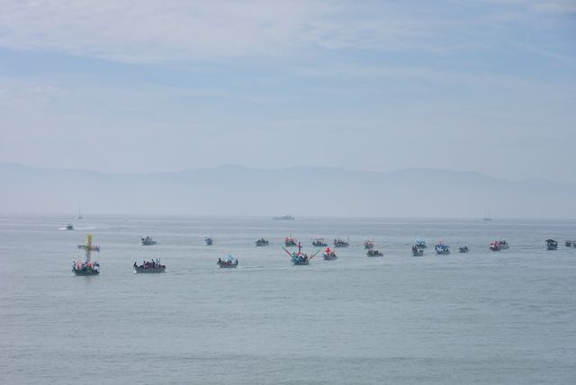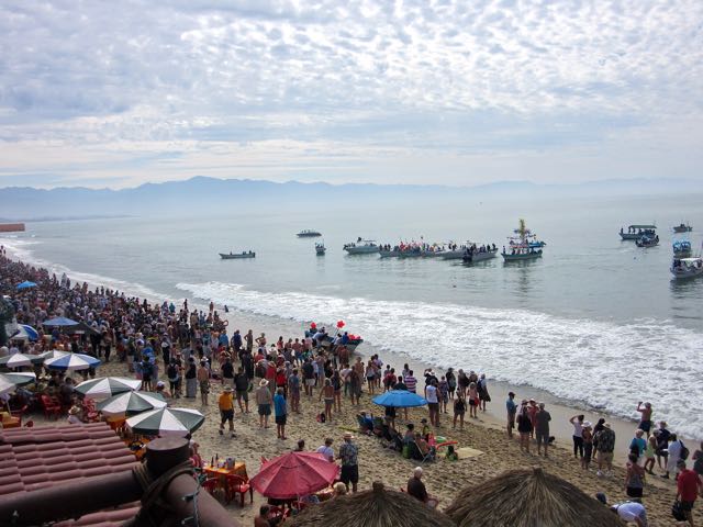 Jocelyn wanted to see the boats arrive for the annual blessing of the boats during the Bucerias town festival. They came across the bay from La Cruz. It took two hours as they traveled slowly in a cross formation.