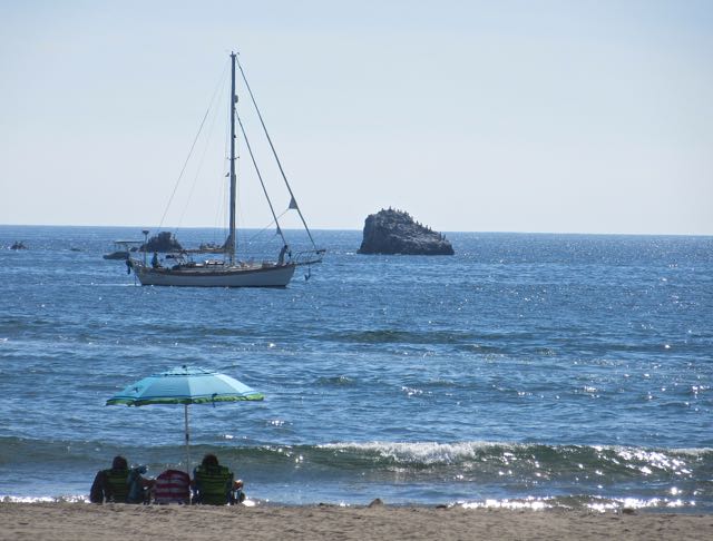 Sailboat coming in just in front of a few RVers.