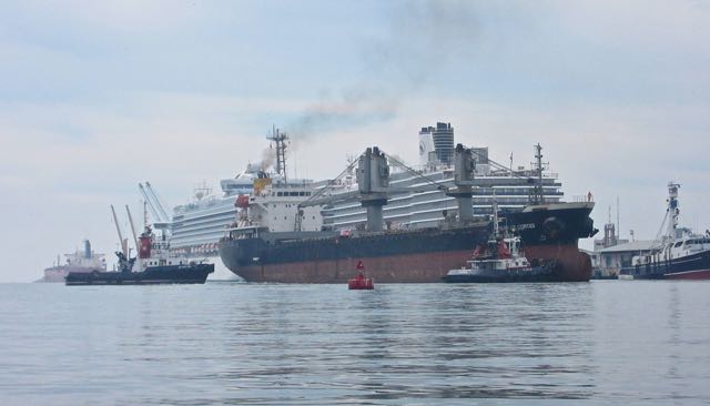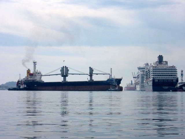 Just behind them was a freighter being pushed out into the shipping channel.  The port is becoming increasingly busy.  Note the two freighters  in front of the white Princess cruise ship.