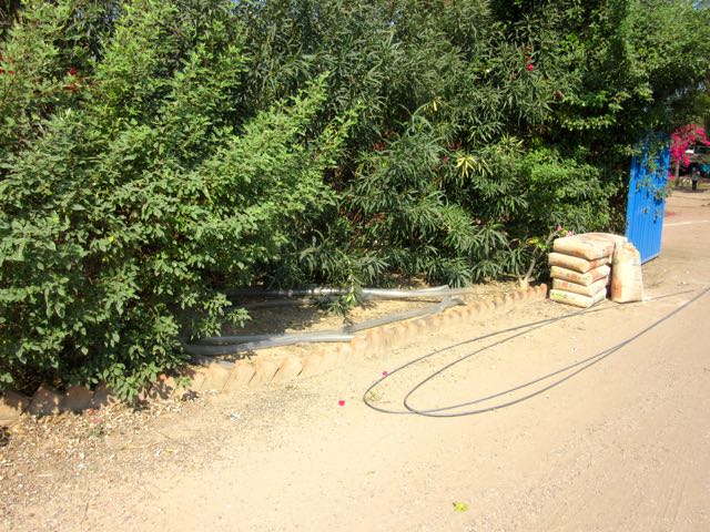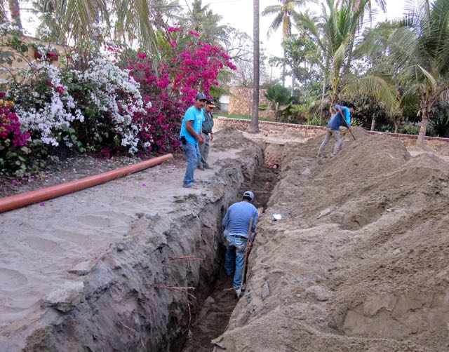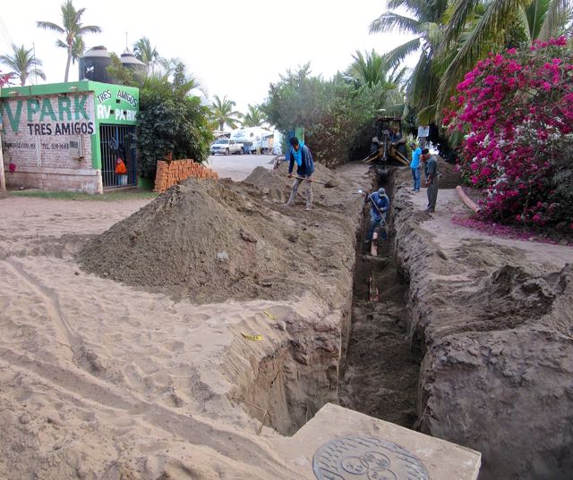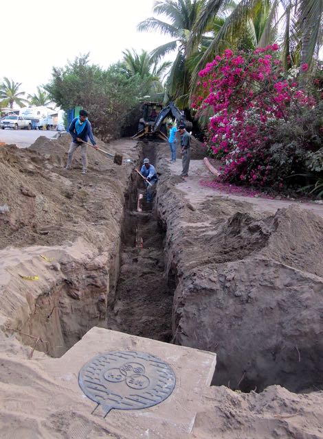 Early the next morning workers appeared. It seems that David has now decided to run a sewer line from each of the 2 RV parks to the new main sewer line that is being installed on the Isla. He is starting with our park first.