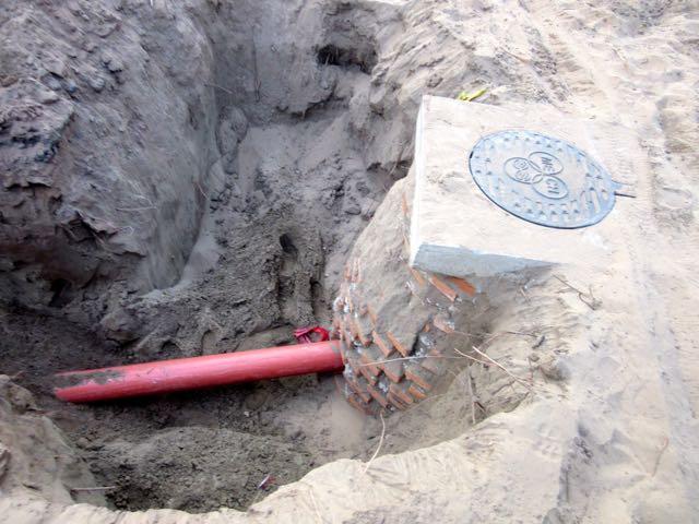 They worked all day. The main sewer line is at least six feet underground. They had to dig down to this previously ( and covered ) installed man hole.