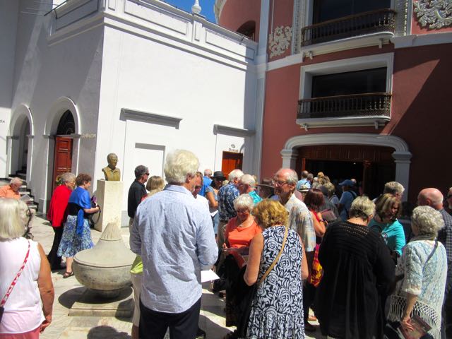 We were meeting friends, Hannelore and Peter at the Plazuela Machado as we were attending a Sunday afternoon concert, one of the Camerata Campbell ‘symphony’ concerts.  This is the seventh year that Maestro Gordon Campbell had been putting on these Sunday afternoon concerts, some more symphonic than others.  We have been fortunate to attend some of the concerts every year since the very first year.  The reason the concerts were scheduled to start at noon is so that men could attend and still get home in time for their Sunday afternoon sports 🙄 Cost of each ticket is 300 pesos/$20.70CAD/$16.00USD  no matter where you sit in the Teatro Angela Peralta, so best to get your tickets early and have a choice of seating.  The program for 2019 has been chosen and it sounds wonderful.  We saw so very many friends yesterday.  Blogger Kathy who writes Kathy and Eric’s Travels were the first people we saw.