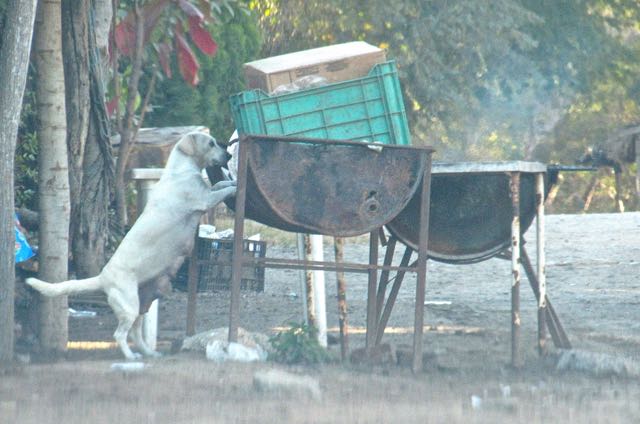 Next stop was to pick up our laundry. Yes, he was there. While Colin was inside I took this shot of the dog hopping up and down all around this grilling drum.  He was really trying to get a scrap or two.