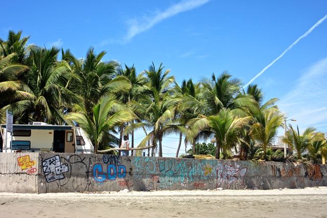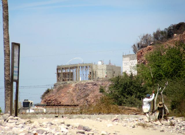 We went to the near end of the beach for our walk and noted that the boondocker is still there.  However there is some work going on.  Impossible to tell from this photo, but there is a row of palms being planted along the inside edge of the wall.  Somehow I don’t think that that RVer is paying to have shade put in.  Just above the word GOD you can see a fellow carrying some wood.  He is clearing up the area and placing debris very near the RV.  It will be interesting to see if the RV is still here for Semena Santa.