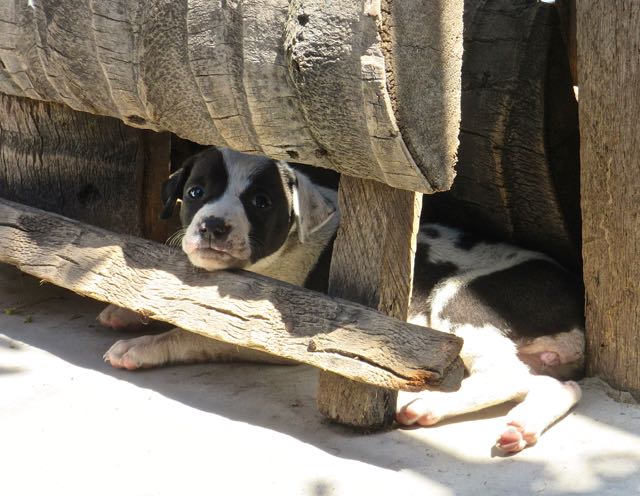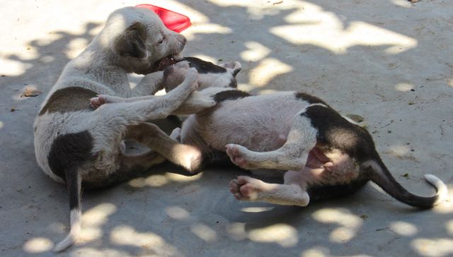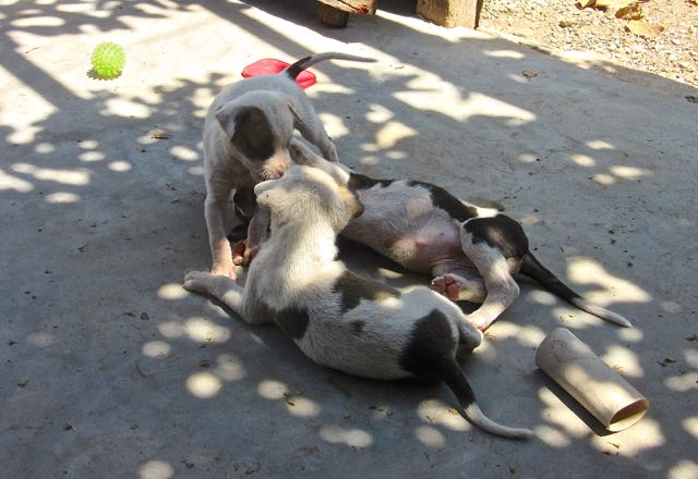 Today I went to visit Ann and say adios to the puppies.  They are for certain going to the shelter tomorrow morning and she has made her own arrangements to go with a few others so instead of us driving them in they are going by truck taxi, lancha and pulmonia.  She plans to stay as long as she can with them tomorrow.  It is going to be difficult for her to leave them behind.  There is a possibility that one of them may already have someone interested in adopting her.  But first they must go to the shelter, be checked by a vet and dewormed etc and spayed when the time is right.  Yes, it now appears that all three may be female.  I hadn’t seen them for five days or so and they have really grown.