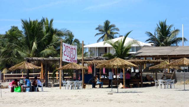 Plastic tables with proper dining room chairs for rent. These all have to be carted to and from the beach every day. Right now there are more shaded seating areas than there are people but that will change.