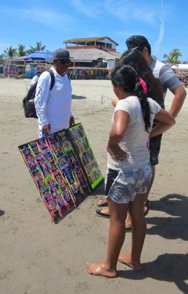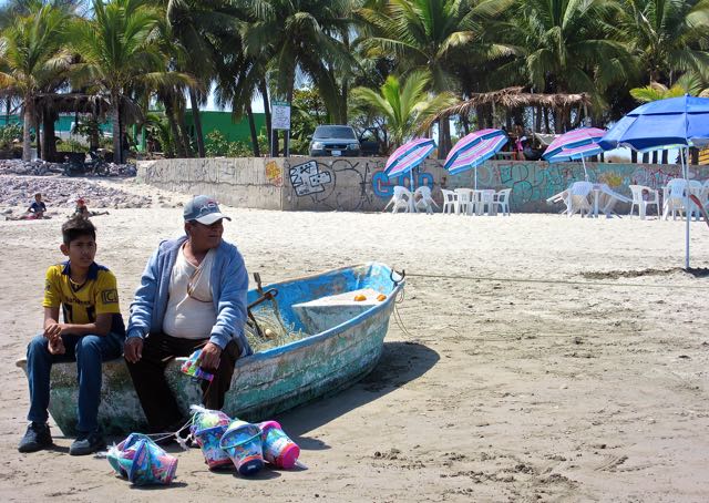 A vendor and his son take a break. Behind those for rent tables and pink umbrellas, up top of the wall is lean to palapa selling drinks. This is the area that the boondocker has been in. Guess he and his RV were not welcome during Semama Santa.