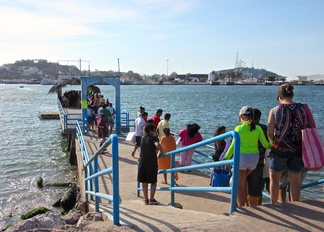 Line ups starting for the Playa Sur ferry mid afternoon.