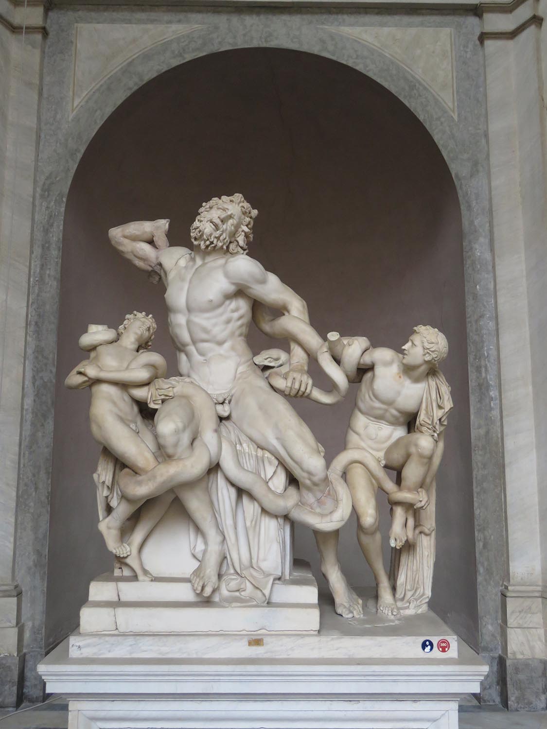 The Laocoon is a sculpture group from 30BC.  It was found in 1506 on the Esquiline Hill in Rome.  It is housed in the Pio – Clementine Museum and is also said to be one of the most important pieces of art in the Vatican collection.  The sculpture depicts a Trojan priest Laocoon and his two sons losing a battle with to the death with two sea serpents.  This would be a good one to look up as it relates to the Trojan War when the Greeks leave a giant wooden horse outside the gates of Troy.