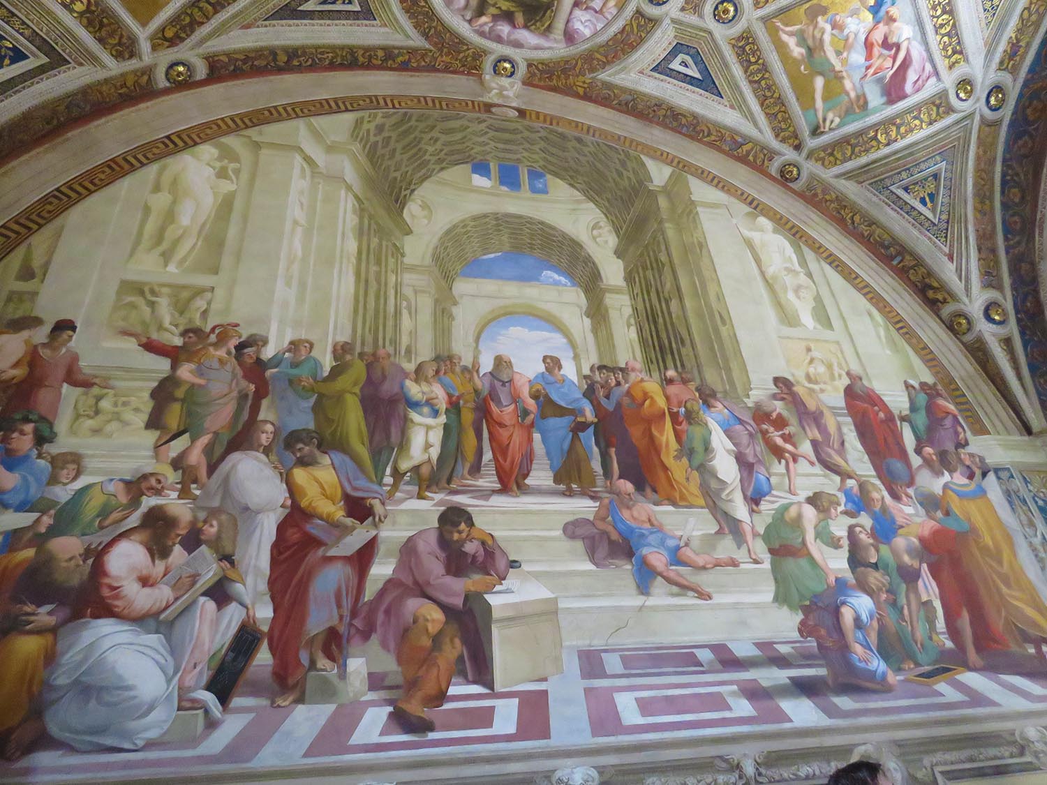 We passed through the Papal apartments of old, the Pope lives in another wing.  Here we are in the Raphael Rooms looking up at ‘ The School of Athens ‘.  This is one of the most famous paintings in the Vatican Museums besides Michelangelo’s painting of the Sistine Chapel ceiling. The painting is fantasy gathering of the greatest philosophers, mathematicians and thinkers from classical antiquity.  They are all together in one painting even though they came from different places and different moments in time.  Raphael had fun with this painting and as he used the faces of Plato, Aristotle, Leonardo Da Vinci, Donato Bramante, Euclid and Raphael himself.   Michelangelo was front and center in the purple coat, brown pants and his working boots leaning on the desk.  The others are barefoot or in sandals but Michelangelo is wearing his signature leather boots.