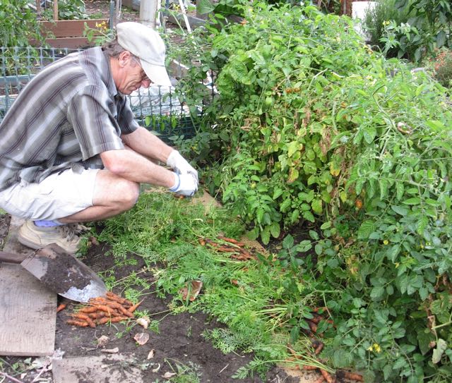 Our carrots have been slow to grow but it was time to see what we had grown.  Only half of the row grew but certainly enough.  We have been nibbling today and they are great raw and so very sweet.  The five tomato plants to the right of this shot are still producing as is the the Swiss chard.