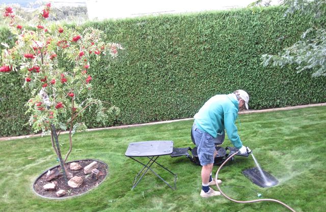 After 8 hours of  doing photoshop on his computer today,  Colin went out to do some physical things. like cleaning the Weber BBQ in preparation for our departure.  He also put some patio furniture away.