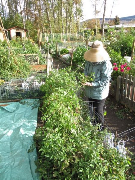 Time is short and Colin got up and went straight to the garden at 8AM.  I was about 40 minutes behind him.  Here I am taking the tomatoes off the plants.  It was very cold out and I had multiple layers on but still needed my hat because of the sun.  Yes I was wearing socks in my sandals.