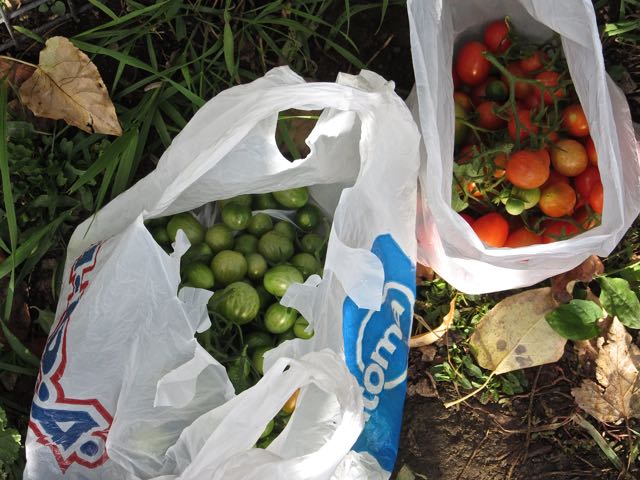 The red ones for us and the green ones in a much larger bag for a neighbor who is going to can them.