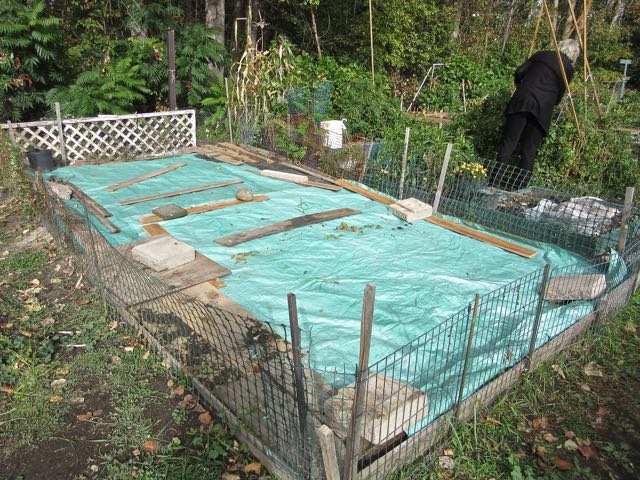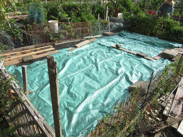 Our plan is to cover the ground with a tarp until we are back first from Mexico in April and then from Europe end of June.  That should keep the weeds down.  We will plant a few things the end of June.