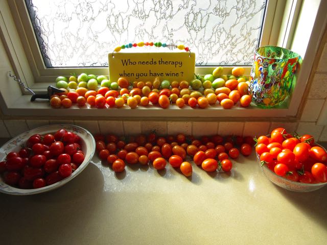 We certainly won’t run out of small tomatoes before we leave.  The bowl on the left is ready to eat and the one on the right will be ready in 2 -3 days.  Than I have a variety of others on the counter and on the window ledge to enjoy as they ripen.