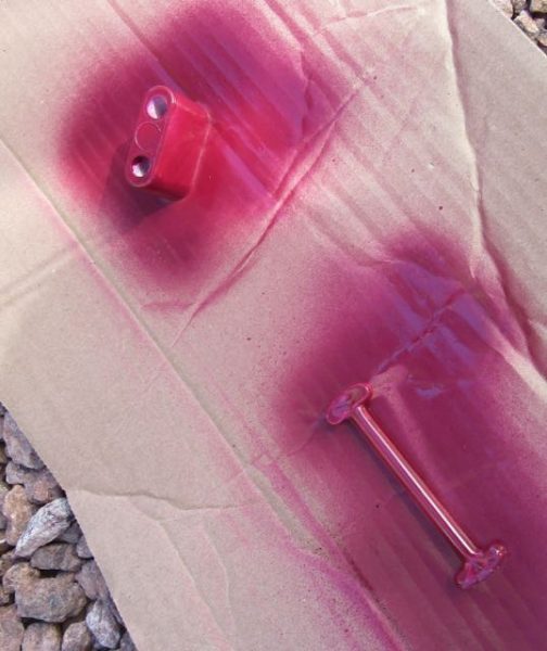 A year ago I had ordered a new door latch except that it was white. So while out the day prior we picked up some similar colored spray paint. Certainly not an exact match to our custom paint job but close enough.
