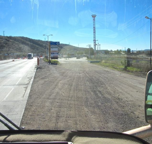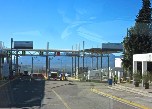 Just after the first toll booth comes the inspection station.  Unlike last year where we were very thoroughly checked this year the border agent’s duty appeared to be to simply check the VIN number against your registration papers.  Be sure to have your vehicle(s) papers ready along with your passport.  As you can see we would be third in line.  It is clearly marked to cross over to the far right marked autobus.  Our VIN for the RV is in a bedroom closet so the agent had to come in.  However he was not interested in what we had inside the RV, not the alcohol nor food contents, etc.  He checked the Jeep VIN but unlike last year did not ask to see what lay under the blankets (my garden soil ).  I believe that going in a little later worked to our advantage.