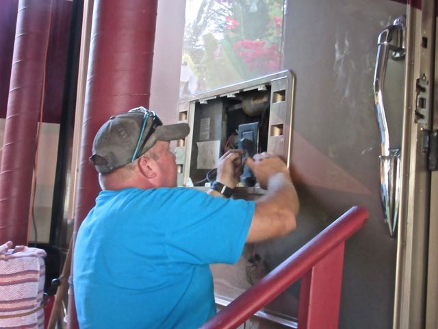 Eric dropped by to deal with an emergency RV electrical issue for a neighbor.  He had some spare time so he installed our fridge fan.  It wasn’t an easy task with the cramped space but it is nice to have that working again.