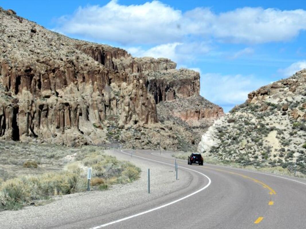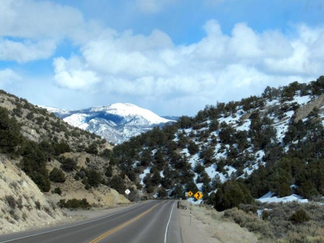 Approaching the 7316′ summit just before Ely, Nevada. We drove though a few low clouds that actually were snowing on us, as we passed through that particular area.