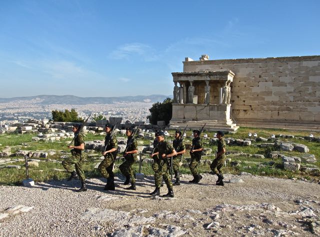 We had just missed the raising of the flag.  On April 27th, 1941, the Nazi German army entered the Greek capital of Athens, signaling the end of Greek military resistance which began with a valiant struggle against Mussolini’s Italians in October 1940. They ordered one of the evzones, the elite soldiers of the Greek army who are the guardians of the flag which flies over the Acropolis, to remove it. The soldier obeys, then wraps himself in the blue and white flag and leaps from the walls of the ancient fortress to his death.  The soldier was protecting the flag of Greece.  To this day every night the flag is lowered and the Anthem is sung and every morning the flag is raised and a soldier steps to the edge and shouts out over the city “Good morning Athens, good morning to each of you”.  Never again will a soldier die because a flag was left unprotected, this is why the flag is raised & lowered each day in Athens over the Acropolis.  We had just missed the raising of the flag but were able to see the soldiers leaving.  My photo.