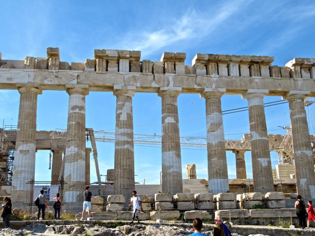 The white parts are from the ongoing restorations. At the moment there is a crane on site. An explosion caused by a bombardment in 1687 crumpled the Parthenon into ruins.  The monument was restored during 1900 to 1930 with the use of iron reinforced concrete and iron clamps which subsequently corroded and expanded producing serious damaged to the marble and led to serious structural problems.  In 1981 these restoration interventions began.  I fear that this will be a constant project.  My photo.