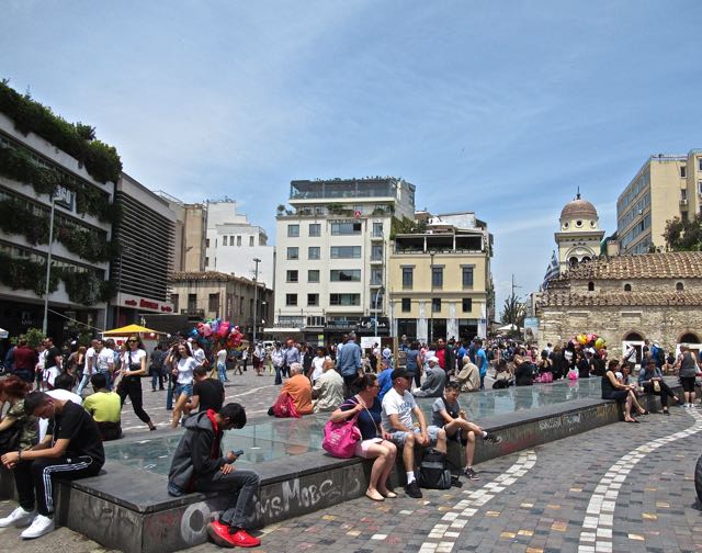 Somehow our meandering got us to the famous Monastiraki Square.  This area was even busier than anywhere we have been to date. Please take note of the tall building in the center.  On the second level down from the top you can see a bit of red which is an A, as in A is for Athens.  More on that later.  We eventually  staggered ( well I did, I was totally done ) out the area and headed towards home.